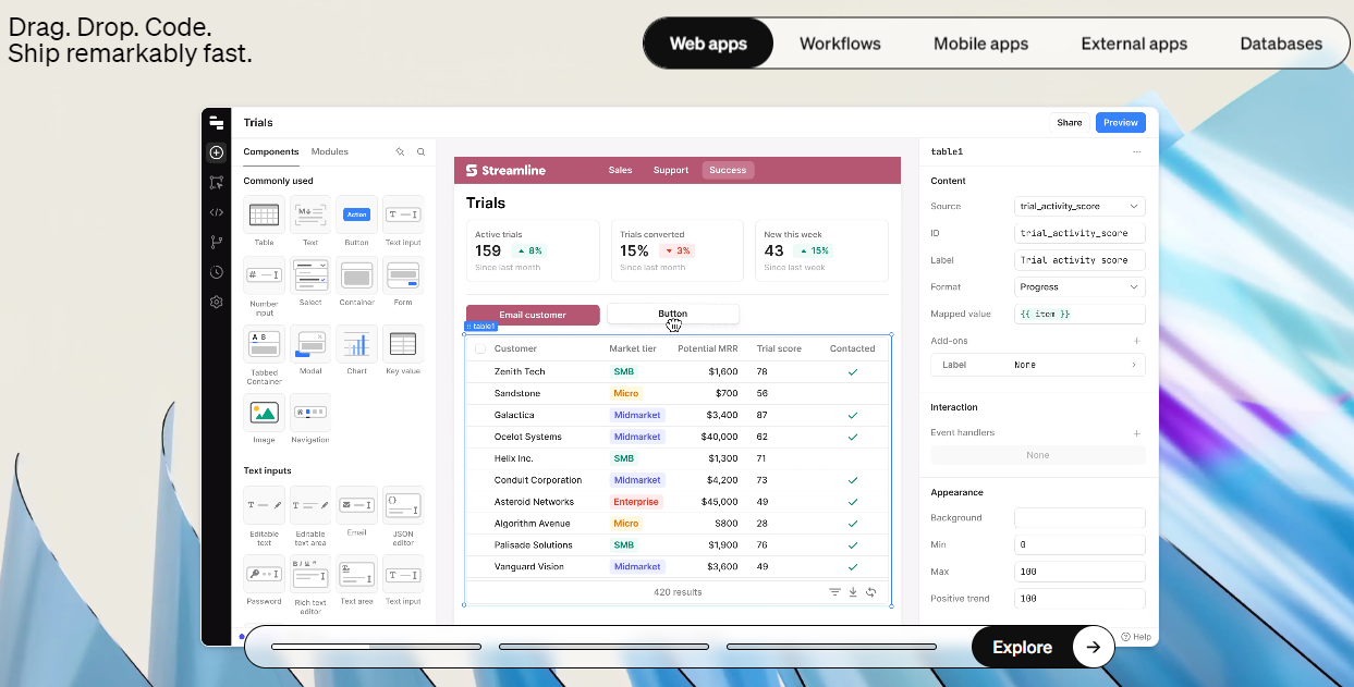 Retool은 테이블, 차트, 목록, 지도, 마법사, 양식 등과 같은 강력한 빌딩 블록을 제공하여 내부 도구를 만드는 데 필수적인 도구를 제공합니다. 결과적으로 라이브러리를 찾아다니지 않고도 UI에 작업을 수행하고 더 빨리 제공할 수 있게 됩니다.