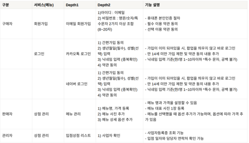 작성해야 하는 내용은 구분, 서비스(메뉴), Depth, 기능 설명, 레퍼런스로 구분됩니다.