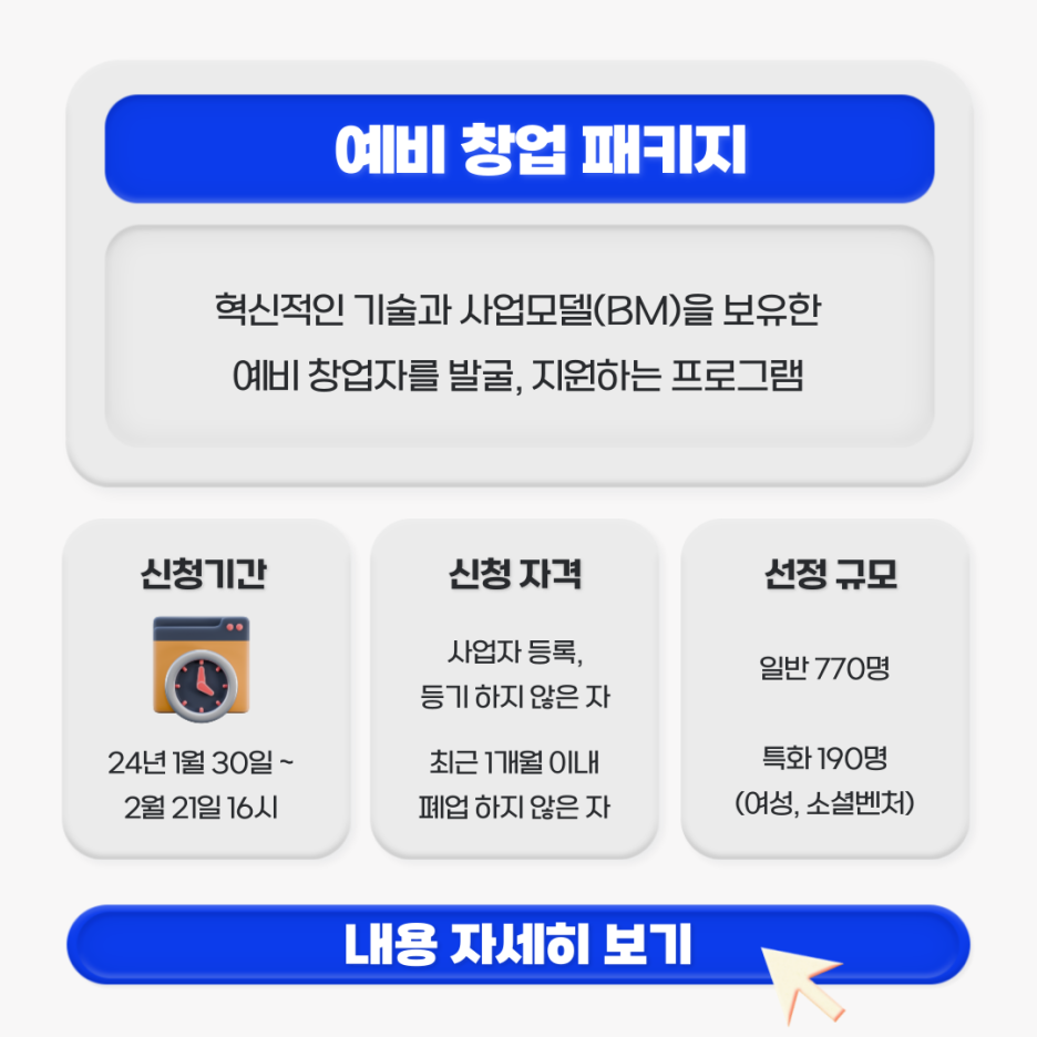 예비 창업 패키지는 혁신적인 기술과 사업모델(BM)을 보유한 예비창업자를 발굴, 지원하는 프로그램입니다.