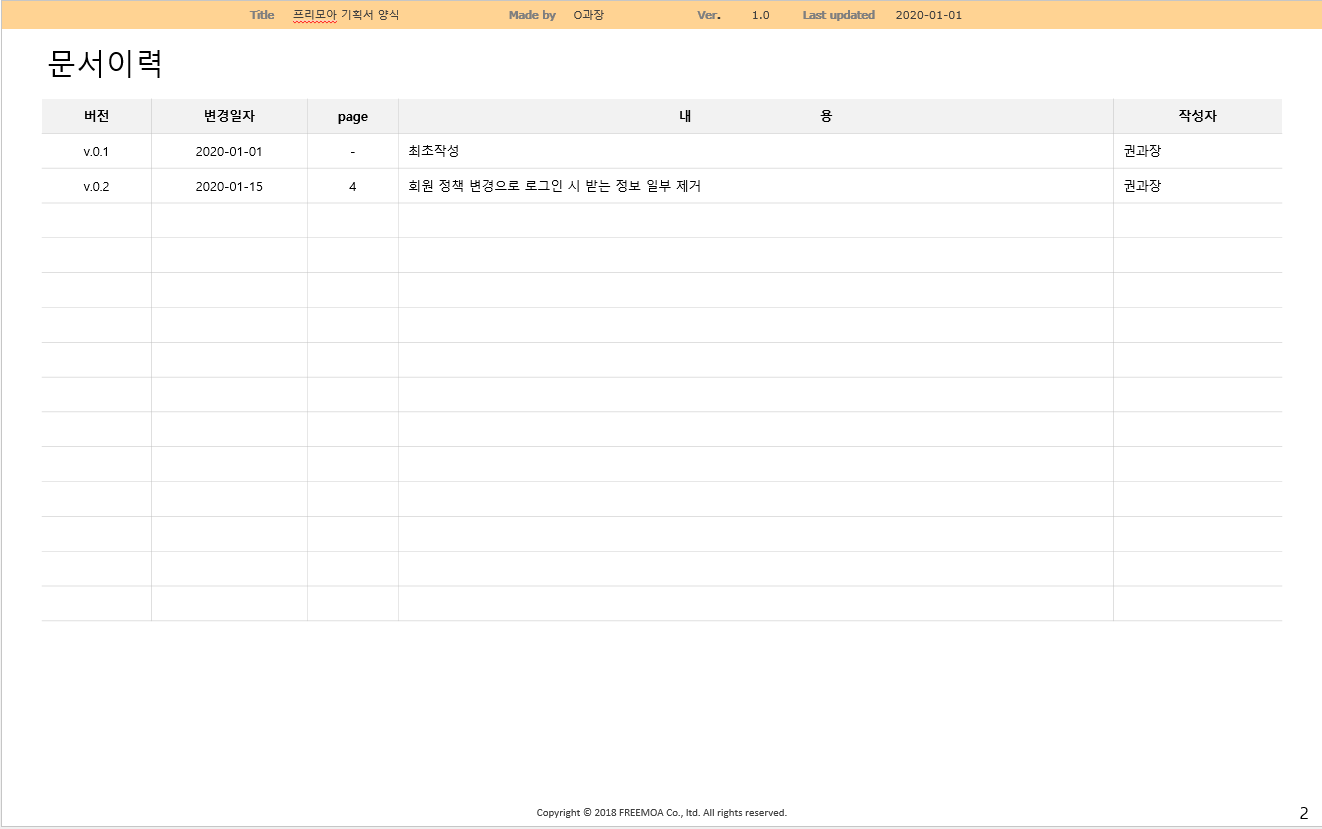 작성된 기획서는 최초 작성 후 관련 여러 이해당사자들과의 의견 개진이나 환경에 따라 수정이 많이 이루어질 수 있습니다. 문서는 디자인, 개발 완료까지 작업을 진행하는 작업자와 관리자까지 최종 결과물에 대한 기초자료가 되기 때문에 수정된 정보 에 대한 관리가 되지 않으면 최종 결과물이 원하는 방향대로 나오지 않을 수 있습니다.