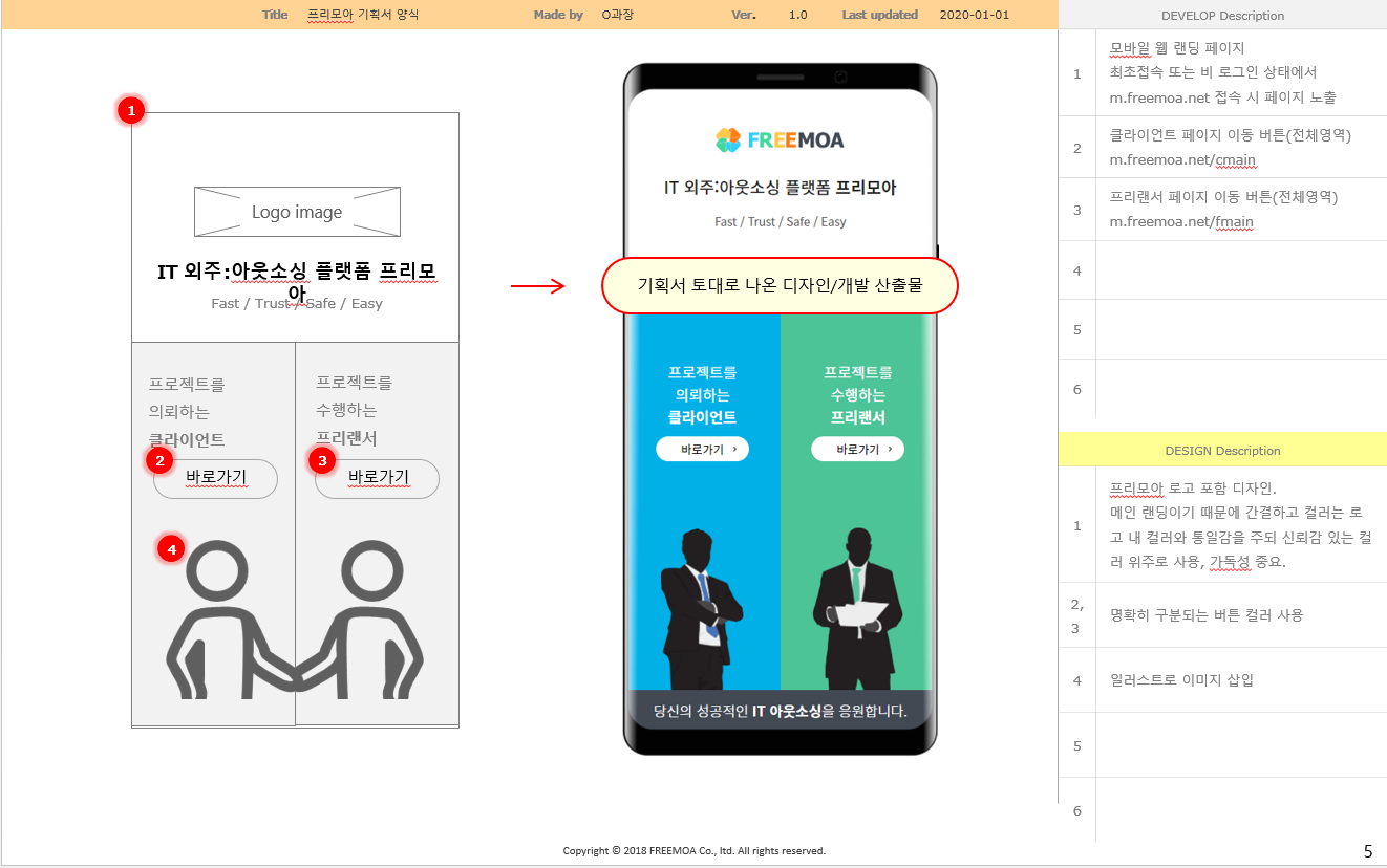 이 또한 지정된 양식은 없으나, 화면을 설계하고 각 요소에 번호(1, 2, 3)로 표기 후 우측의 Description영역에 내용을 작성합니다.설명을 상세히 작성하되, 디자인 보다는 구성요소와 기능에 집중하여 작성합니다. Description영역은 개발, 디자인을 구분 할 수 있고, 구분 없이 하나로 작성하기도 합니다.