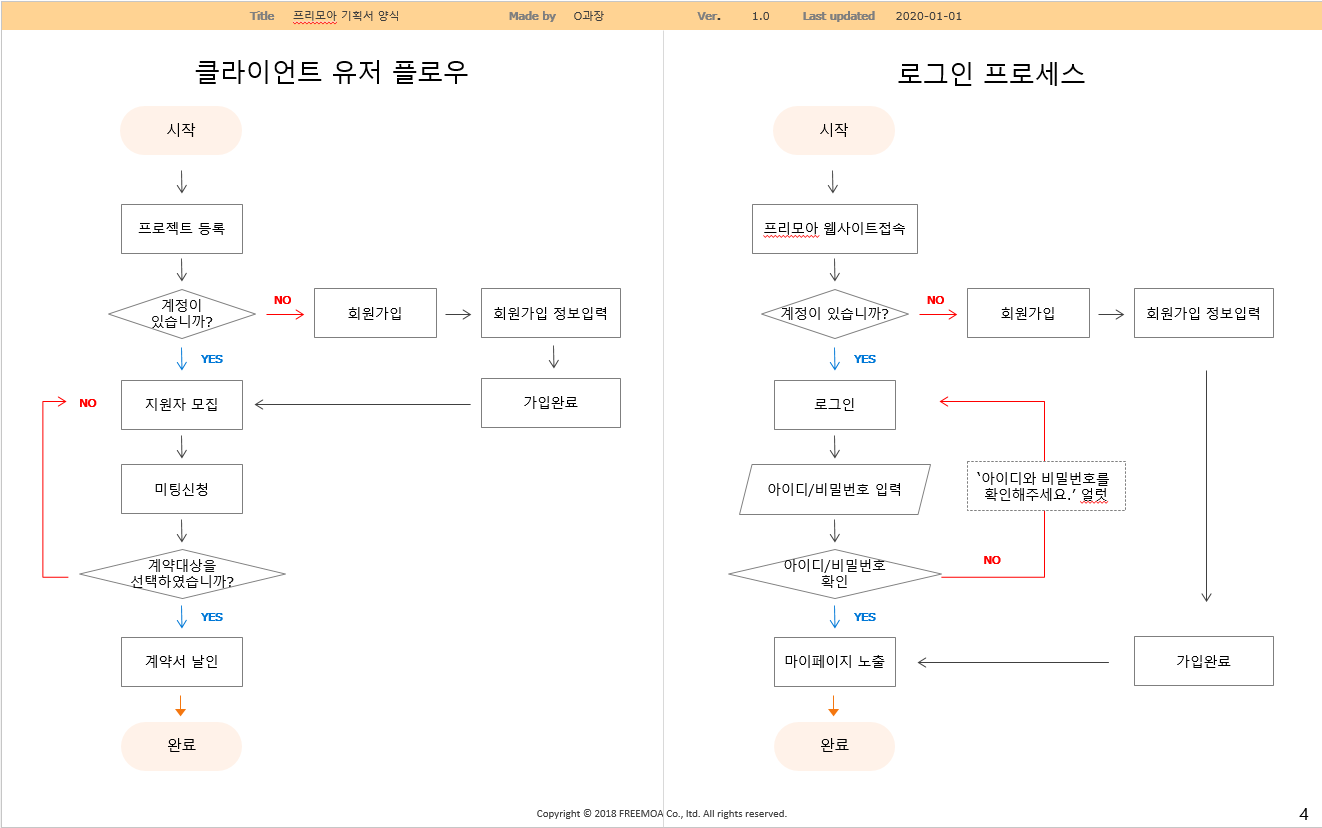 플로우차트에 모든 정보를 작성하려 하다 보면 오히려 이해가 어려울 수 있습니다. 간결히 작성 후 상세 기획에 표기하는 것이 효율적입니다.