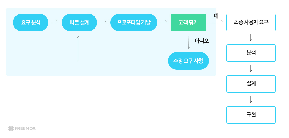 하지만, 이 모델도 단점은 존재합니다. 개발자와 클라이언트의 의사소통을 원활하게 하는 반면, 개발자 쪽에서 먼저 개발하여 클라이언트에게 유사 모델을 제시해야 하는 것이죠.
