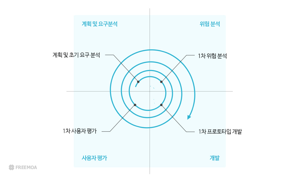 핵심은 단순한 순환이 아니라 '나선형'이라는 것이죠. 나선 모양은 범위를 점진적으로 확장하는 형태를 가지고 있으며, 위험을 최소화하기 위해 개발 과정을 반복하고 결과적으로 완벽한 최종 소프트웨어 개발에 도달하는 모델입니다. 진행 과정에서 클라이언트의 평가가 반영되기에 수준 높은 개발 품질을 보장받을 수 있죠.