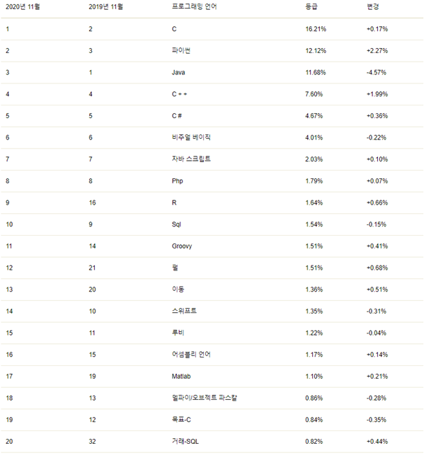 소프트웨어 품질 서비스 공급업체 티오베(TIOBE)가 선정한 2020년 11월 프로그래밍 언어 순위는 위와 같습니다. (등급은 전 세계 숙련된 엔지니어 수를 기반으로 한 달에 한번 업데이트됩니다.)