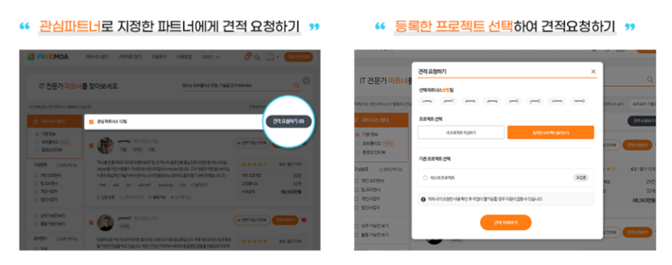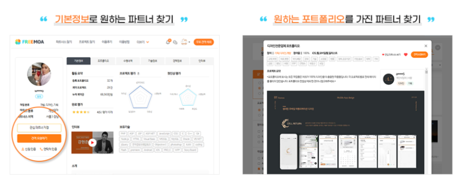클라이언트 직접 자신이 원하는 포트폴리오를 가지고 있는 개발 업체 및 프리랜서를 한눈에 쉽게 찾을 수 있고 서로 소통을 할 수 있습니다!