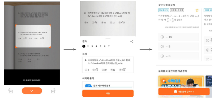 또 다른 성공요인은 ‘광학 문자 인식(OCR)기술’이라고 할 수 있는데요. 학생들이 모르는 문제를 모바일폰으로 찍어서 검색하면 자체 개발한 AI 기반의 광학 문자 판독(OCR) 기술이 이미지에서 글자와 수식을 추출하고, 변환된 텍스트에서 사용된 개념을 추론하여 그에 맞는 풀이를 데이터베이스(DB)에서 빠르게 찾아내 제공합니다. 현재 약 11억 건 이상의 누적 문제 해결 데이터가 구축되어 있다고 합니다.