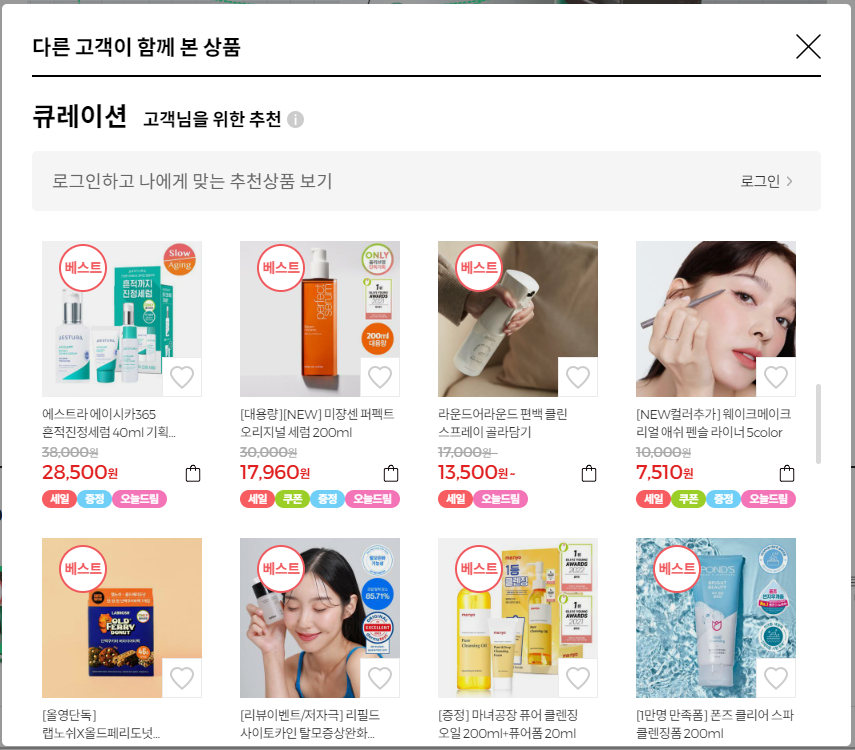 이 제품을 구매한 사람들이 많이 구매한 항목, 혹은 제품의 재고가 없을 때 ‘이 제품은 어떠세요’ 등의 기능이 있는 경우입니다. 대체 제품이나 세트 상품 등을 강조할 수 있는 방법으로 평균 주문 비용을 높일 수 있는 효과가 있습니다. 처음 이 방법은 미국 아마존이 시작했으며, 요즘에는 대부분의 쇼핑몰에서 구매데이터 등을 활용해 추천 및 큐레이션 기능을 활성화 해놓는 편입니다.